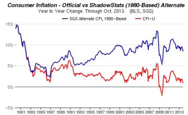 For inflation, using the 1980 methodolgy, where the same basket of goods and services are continually compared, the rate for 2011 is 11.5%, 2012 9.9%, and 2013 9.5%. This matches closely the Chapwood index that measures the 500 most purchased items by the average American. So why are the CPI readings for 2011, 2012, and 2013 1.2%, 3.3%, and 1.2%?