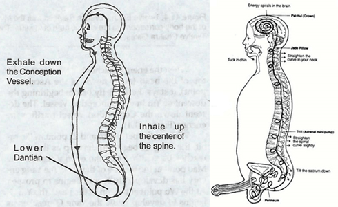 The Small Cycle is the main pathway, and visualization technique, of tantric yoga. Traditional texts suggest using a combination of breath and visualization to push the Energy around this circuit. The Large Cycle is much the same but includes the arms and legs. With each breath the focus slowly shifts to the next hoop, there being hoops also at the frontal path. So, on the way down, you visualize the movement to the next centre on the out-breath, and then, on the in-breath you perform a small circle around the centre. The same occurs on the way back up the spine, but with the movement up occurring on the in-breath. There are three breath cycles as you circulate the Qi around the skull, before heading back down the front again. As the channel is narrow through the palette, and you want time for the saliva to absorb the hormones, some texts suggest two cycles here also. The visualization exercise should always end at the abdomen with three horizontal circulations.
